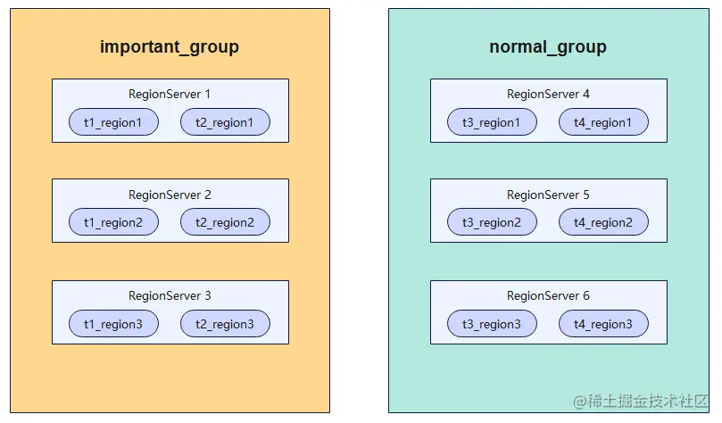 上图中RegionServer1、RegionServer2、RegionServer3被分配到了Important_group中,RegionServer4、RegionServer5、RegionServer6被分配到了normal_group中。