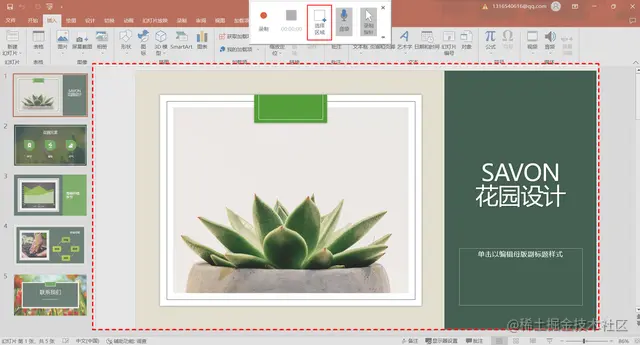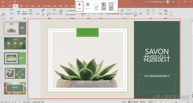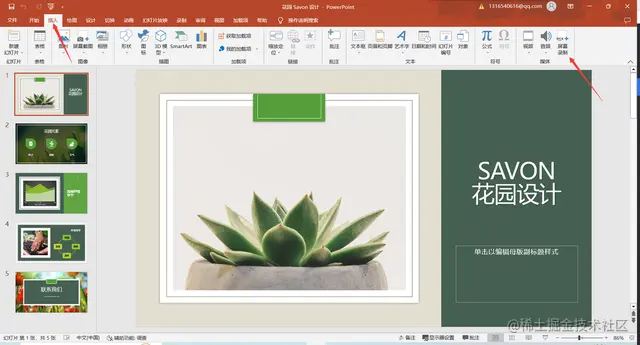 **步骤1:**在电脑上打开PPT文件后,依次在PPT文件上点击【插入】-【屏幕录制】。