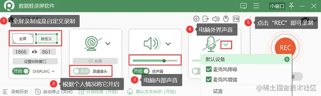 备注:【扬声器】指录制电脑内部声音,【麦克风】为电脑外界声音。