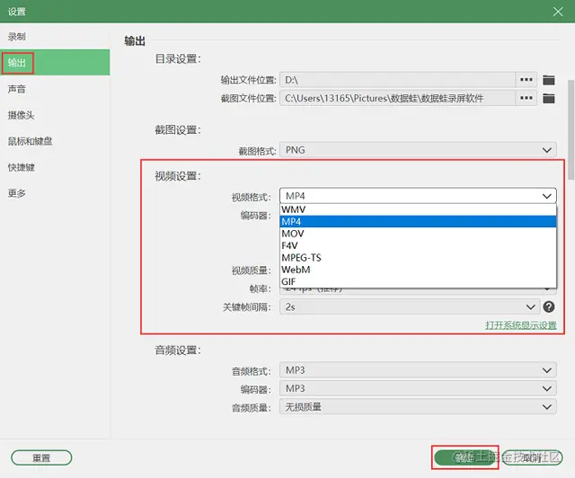 **步骤2:**在录制视频前,如有调整录制参数的需求,可以点击【设置】。在【设置】界面,根据录制实际调整输出位置、格式、编码器、画质、摄像头等参数。您也可以按照软件预设的参数直接进行录制。