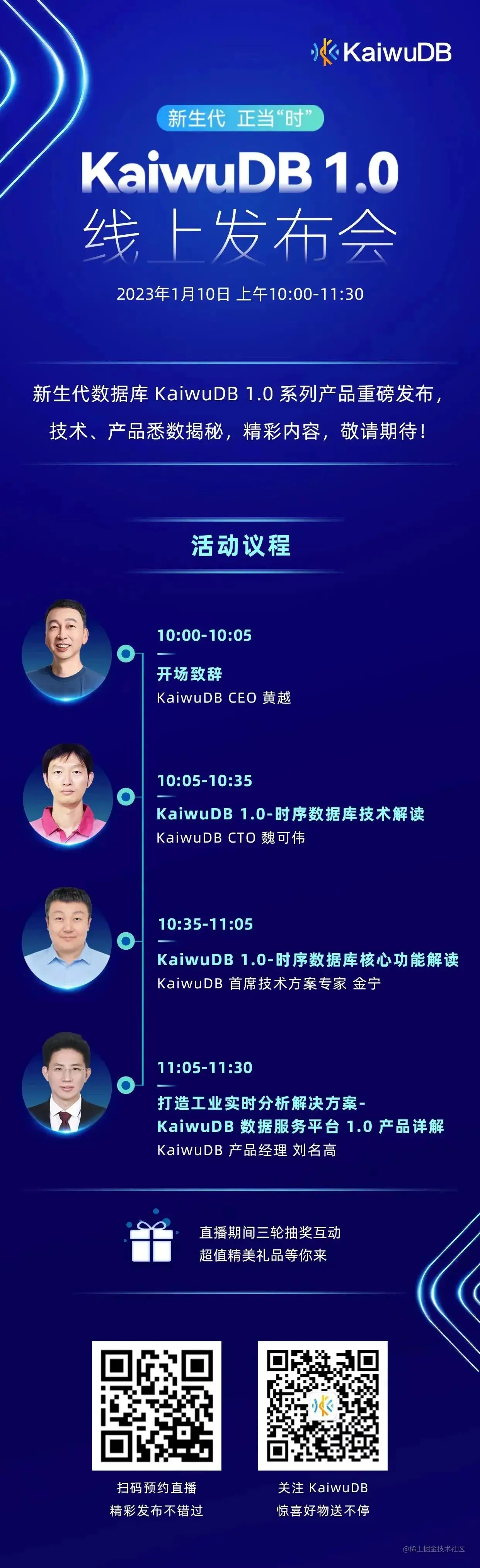 1月10日 KaiwuDB 1.0 线上发布会 KaiwuDB 2023-01-05 92 阅读1分钟 首场重磅亮相 KaiwuDB 是浪潮集团控股的数据库企业,以多模数据库为核心,面向工业物联网、数字能源、交通车联网、智慧城市、数字政务等多种场景,提供领先创新的数据服务软件。 新生代数据库,扬帆起航正当“时”,2023 年度首场重磅亮相,特邀四位重量级嘉宾线上分享,揭秘 KaiwuDB 1.0-时序数据库,期待与你共同见证! 福利惊喜环节 扫描上方二维码预约直播 直播期间三轮抽奖福袋 超多精美礼品等你来领