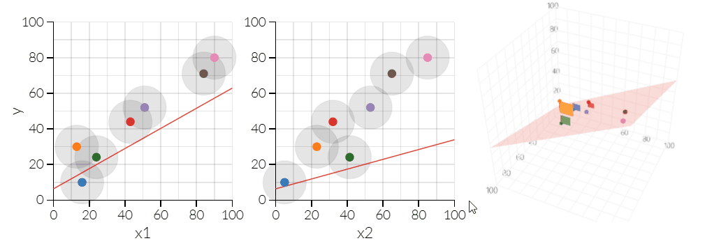 现在,真正的科学家甚至社会学家很少只用一个自变量做回归,但OLS在更多自变量的情况下效果完全一样。下面是有两个自变量的OLS。不过,现在的误差不是相对于一条线,而是相对于三维空间中的一个平面。所以现在OLS的工作是找到这个平面的方程。前两幅图中显示了通过每个轴的平面的切片。