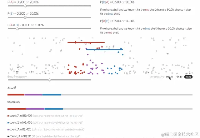 那么给定一个球,它击中了红色架子(A事件),而后击中蓝色架子(B事件)的概率会是多少呢?可以通过给定A的条件概率,即P(B | A)来回答这个问题。