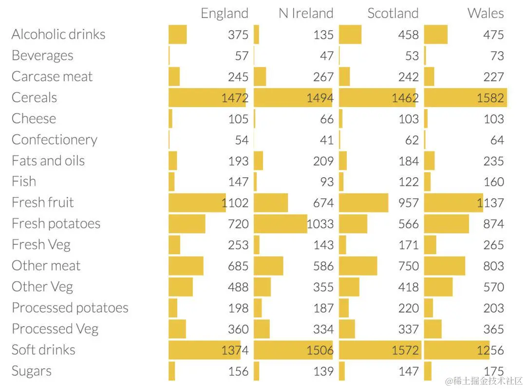 表中是英国每个地区平均每人每周17种食物的消费量,单位为克。这张表显示了不同食物类型之间存在的一些有趣的差异,但总体差异并不显著。让我们看看PCA是否可以通过降维来强地区家之间的差异。