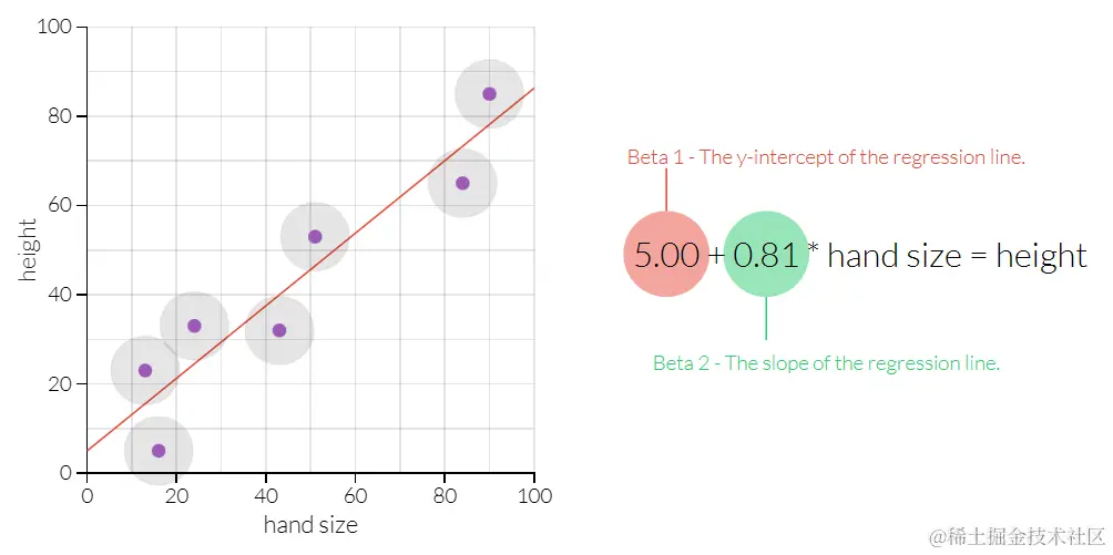 下面,OLS是在幕后进行的,以产生回归方程。回归中的常数--即所谓的 "betas"--是OLS吐出的东西。在这里,beta_1是一个截距;它告诉人们即使手的尺寸为零,身高也会是多少。而β_2是手掌大小的系数;它告诉我们,在手掌大小给定的情况下,我们应该期望某人能长多高。拖动样本数据,看看贝塔的变化。