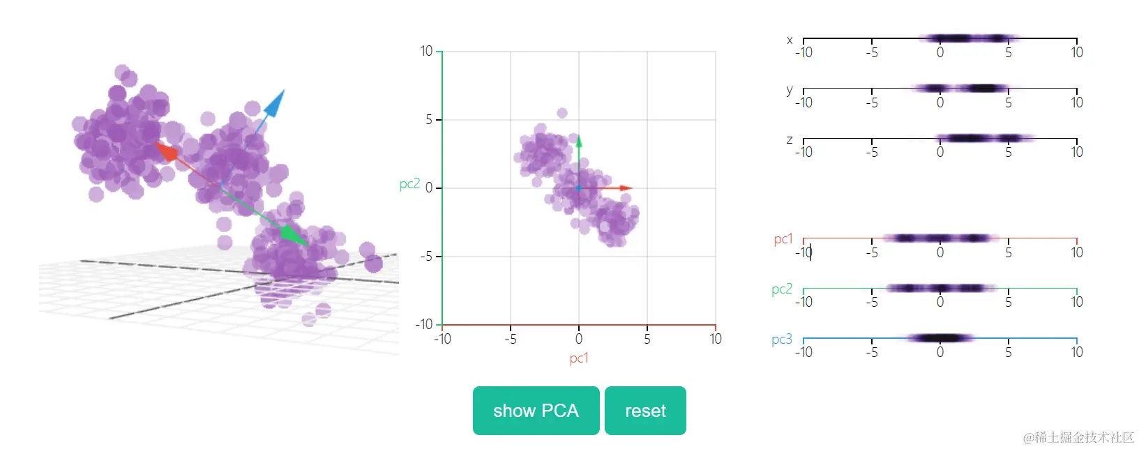看透一个数据云是非常困难的,因此,在3D空间中,PCA显得更为重要。在下面的示例中,原始数据以3D的形式绘制,但可以通过不同的视角,将其投射到2D空间。确定好角度之后,点击“显示PCA”按钮,即可呈现2D的结果。在本例中,PCA变换确保水平轴PC1的变化量最大,垂直轴PC2的变化量次之,第三轴PC3的变化量最少。显然,PC3是丢弃的。