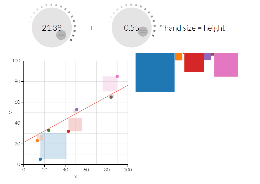 误差是预测和现实之间的差异:真实数据点和回归线之间的垂直距离。OLS关注的是误差的平方数。它试图找到一条穿过样本数据的线,使误差平方之和最小。下面,误差的平方表示为正方形,你的工作是选择betas(回归线的斜率和截距),使所有正方形的总面积(误差的平方之和)尽可能的小。这就是OLS!