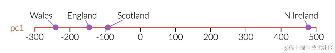 现在,看看第一和第二主成分,可以看到北爱尔兰是一个主要的异常值。一旦回过头来看看表格中的数据,这就显得很有道理了:北爱尔兰人吃的新鲜土豆要很多,吃的新鲜水果、奶酪、鱼和酒精饮料较少。这是一个很好的迹象,我们所看到的结构反映了现实世界地理的一个重要事实北爱尔兰是四个国家中唯一一个不在大不列颠岛上的。