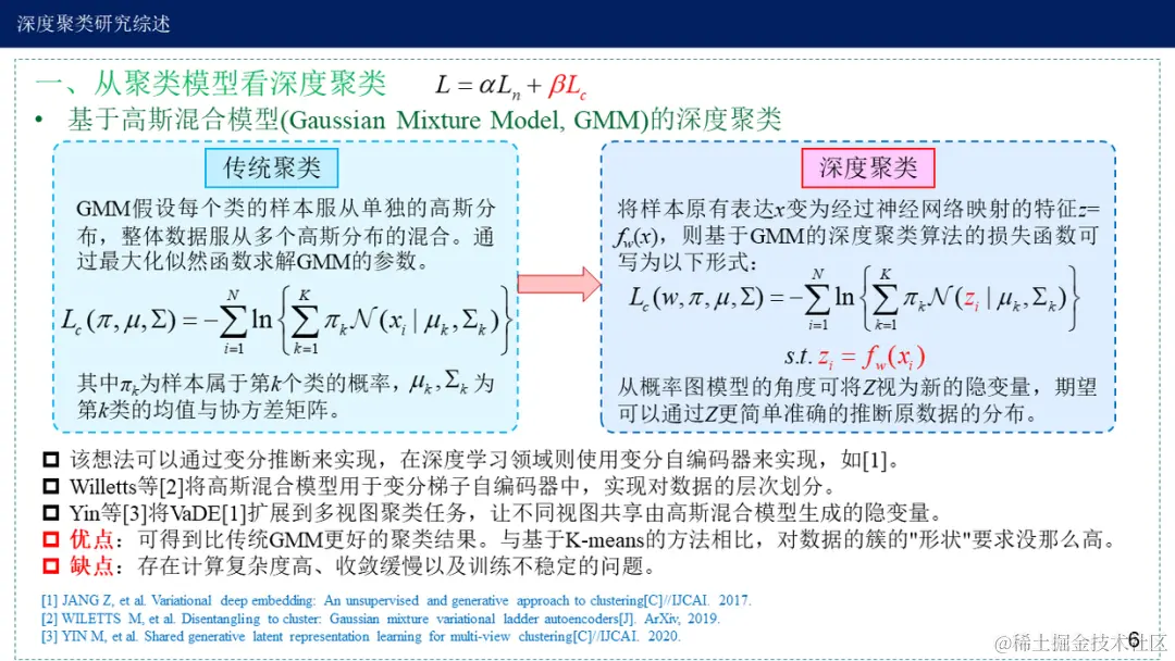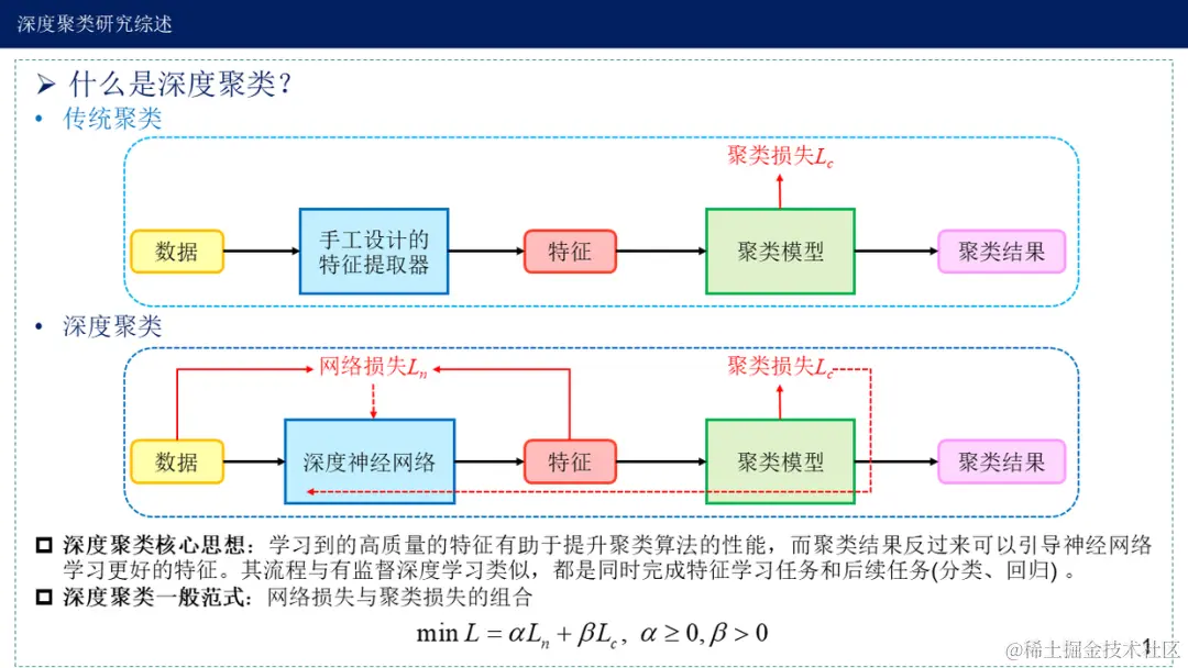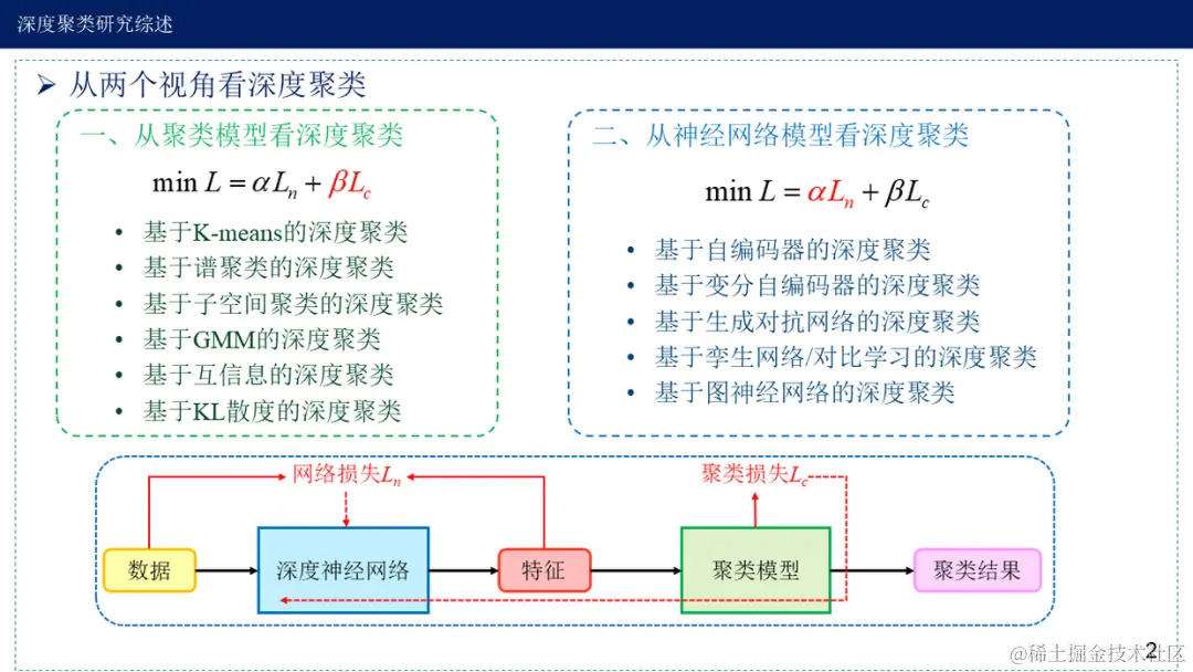现有的深度聚类算法大都由聚类损失与网络损失两部分构成,博客从两个视角总结现有的深度聚类算法,即聚类模型与神经网络模型。