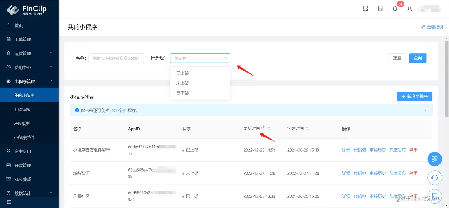 考虑到 FinClip 的用户在管理平台上创建小程序增多,为了管理更加方便,我们在原有小程序创建列表中,增加了按照“状态”筛选功能,同时增加“更新时间”标识小程序状态的变化,并提供排序功能。以此让开发者用户们,能更快更方便的关注到自己上线和发布的小程序。