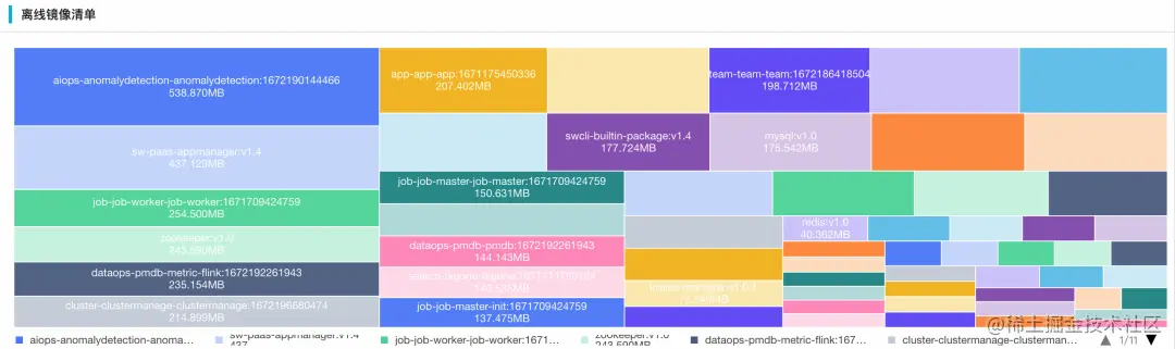 下图为通过 SREWorks 前端组件绘制的按照镜像大小排列的清单矩形树图: