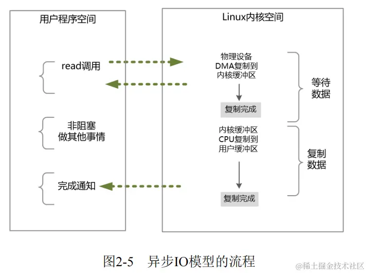 异步IO模型(Synchronous IO,简称AIO),在整个内核的数据处理过程中,包括内核将数据从网络物理设备(网卡)读取到内核缓冲区,将内核缓冲区的数据复制到用户缓冲区,用户程序都不需要阻塞