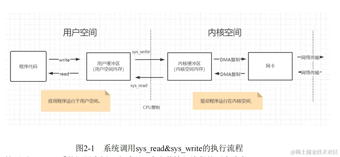 - 上层应用通过操作系统的sys_read系统调用,是把数据从内核缓冲区复制到应用程序的用户缓冲区;sys_write系统调用,是把数据从应用程序的用户缓冲区复制到操作系统内核缓冲区