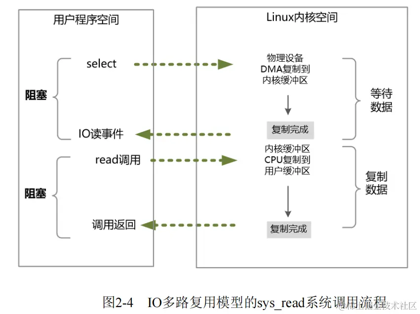 - 用户线程获得了就绪状态的列表后,根据其中的socket连接,发起sys_read系统调用,用户线程阻塞。内核开始复制数据,将数据从内核缓冲区复制到用户缓冲区