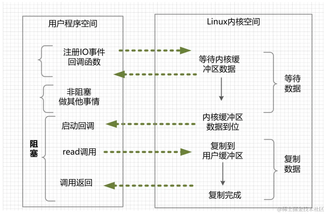 - 在内核等待数据和复制数据的两个阶段,用户线程都不阻塞。用户线程需要接收内核的IO操作完成的事件,或者用户线程需要注册一个IO操作完成的回调函数。正因为如此,异步IO有的时候也被称为信号驱动IO