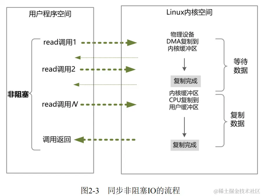- 用户进程(或者线程)在读数据时,没有数据会立即返回而不阻塞,用户空间需要经过多次尝试,才能保证最终真正读取到数据,而后继续执行