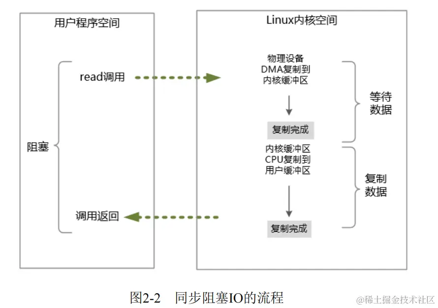 - 在内核缓冲区中有数据的情况下,在数据的复制过程中系统调用是阻塞的,直到完成数据从内核缓冲复制到用户缓冲。复制完成后,系统调用返回成功,用户进程(或者线程)可以开始处理用户空间的缓存数据