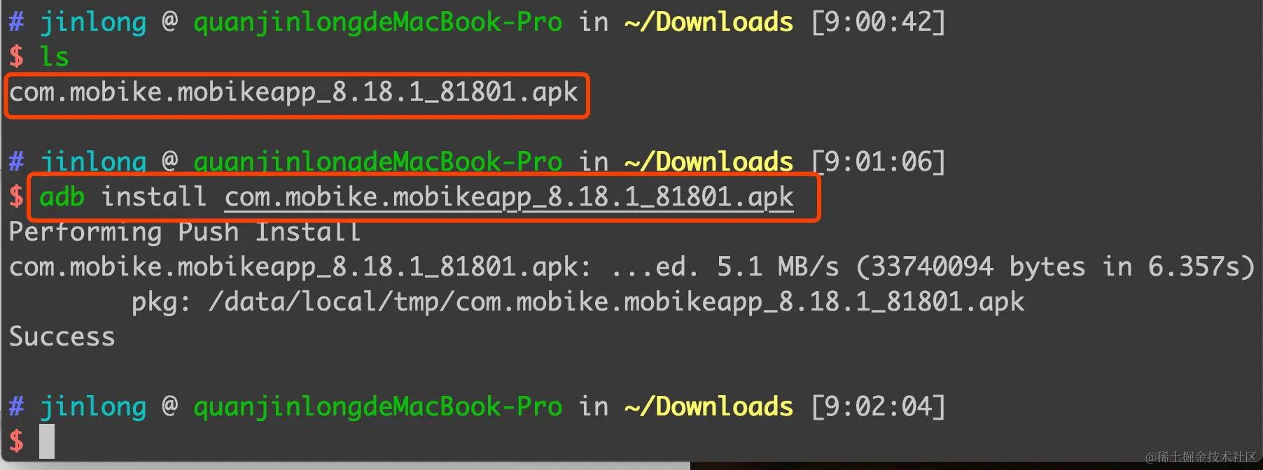 设备已经连接成功,我们需要把“摩拜单车”应用安装到Android设备上,执行adb install 摩拜单车安装文件,“有些手机权限管理比较严格,可能需要在手机上点击同意安装此应用。”