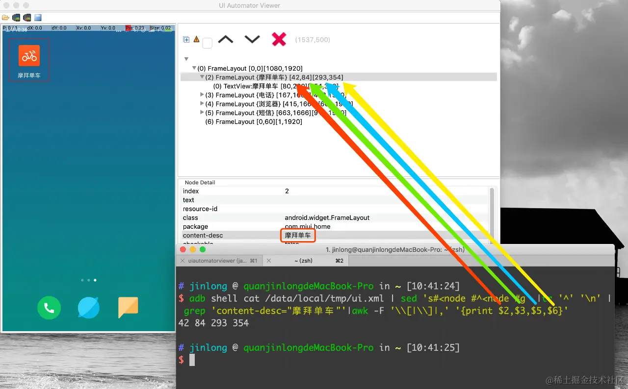 cat /data/local/tmp/ui.xml | sed 's#<node #^<node #g' |tr '^' '\n' | grep '"摩拜单车"'| awk -F '\\[|\\]|,' '{print ($2+$5)/2,($3+$6)/2}'