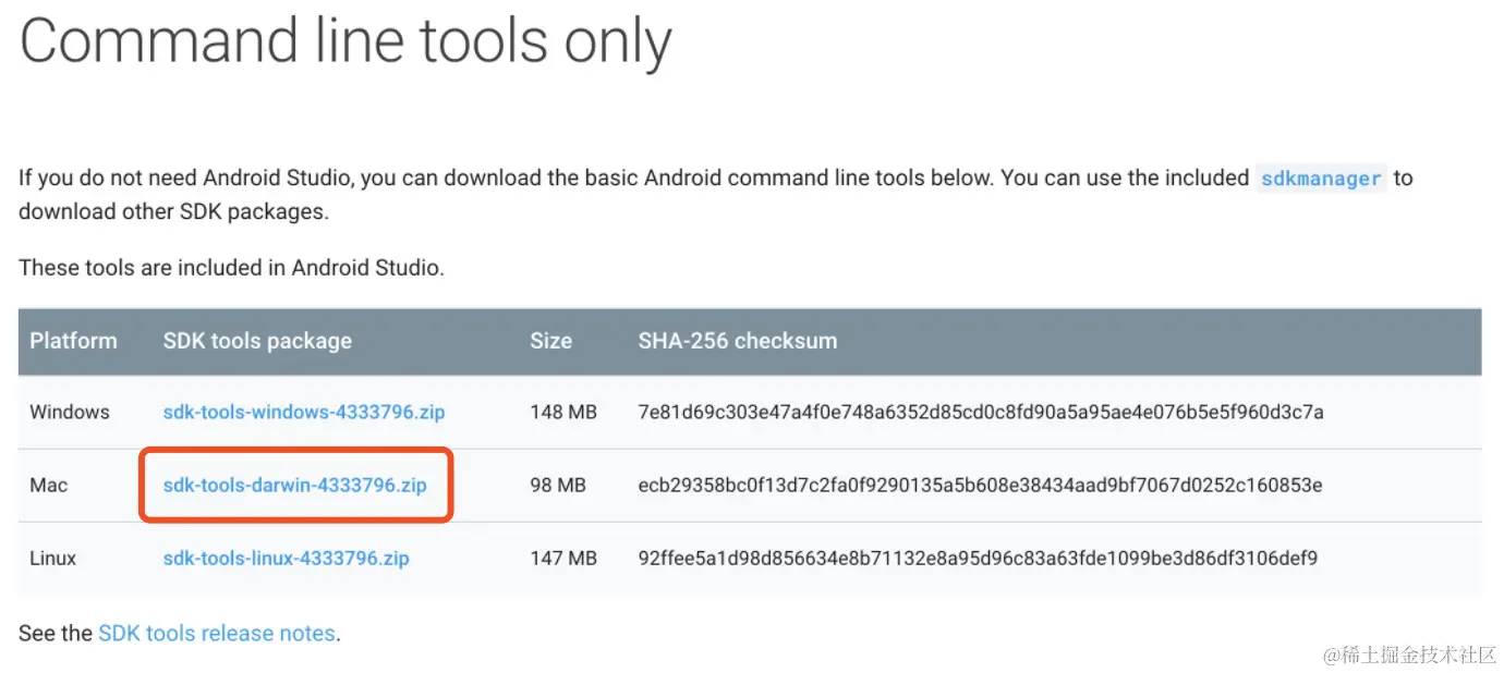 下载 Android SDK:按照系统版本下载相应的zip包。请按照自己的系统按需下载。