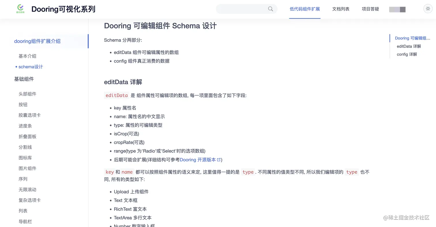 在上面的分析实现中我们可以发现, 只需要把普通组件按照属性对外暴露出来, 并按照 Dooring 的 schema 定义模式来描述出来, 普通组件就可以立马变成低代码组件, 并自动生成组件配置面板: