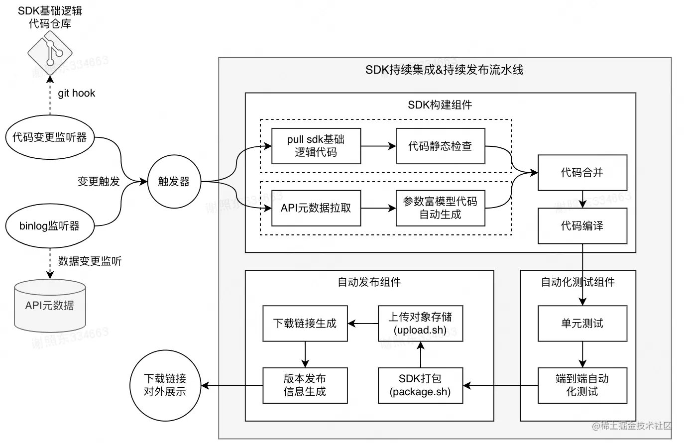 首先我们监听可能导致SDK需要发布的变更,包括通过Binlog机制监听API元数据的变更,以及通过Git Hook机制监听SDK基础逻辑代码仓库Master分支的变更。一旦监听到有变更产生,通过触发器去触发SDK持续集成和发布流水线的运作。