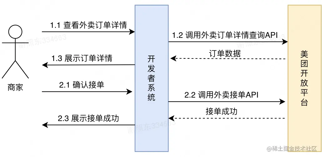 美团开放平台将美团各类业务提供的扩展服务封装成一系列应用程序编程接口(API)对外开放,供第三方开发者使用。开发者可通过调用开放平台提供的OpenAPI获取数据和能力,以实现自身系统与美团系统协同工作的业务逻辑。以外卖业务场景为例,开发者可以在自己为外卖商户开发的应用中通过调用美团开放平台提供的API,提供外卖订单查询、接单、订单管理等一系列功能。如下图所示: