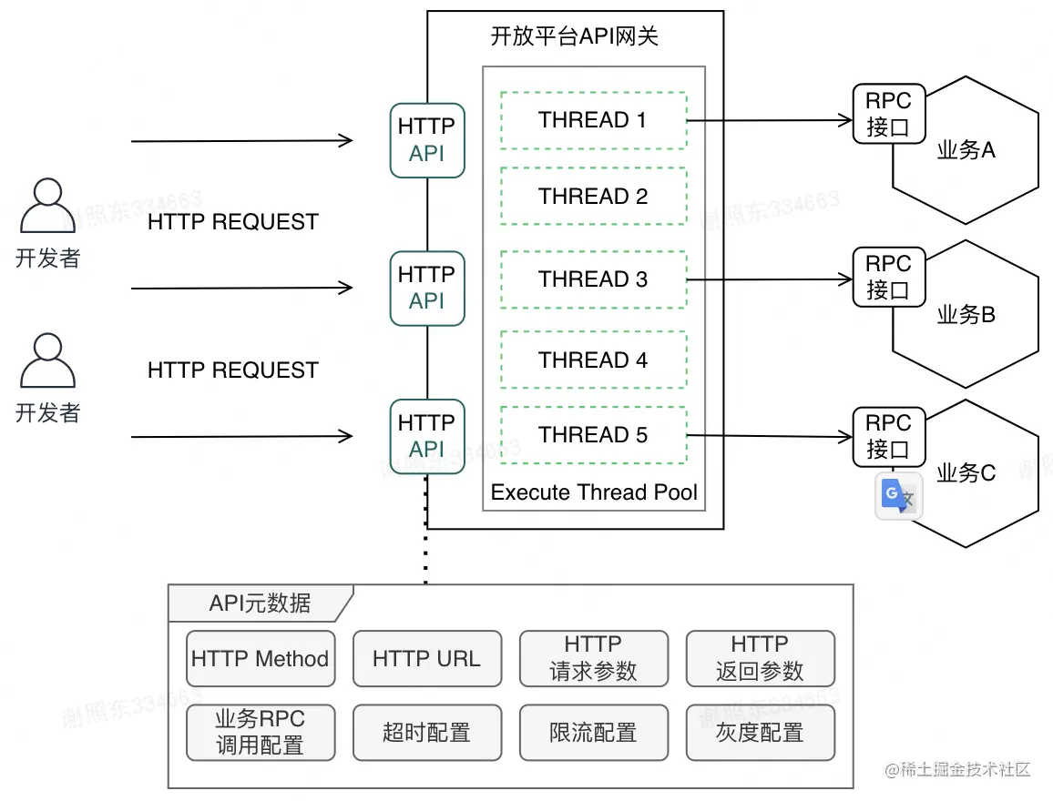 在上述流程中,首先关注作为代码语料生成数据源的API元数据,其来源于开放平台实现的零编码API网关底层维护的基础配置。开放平台网关基于API元数据配置化的技术,可做到零编码将业务服务的RPC接口转化为HTTP协议的API进行开放。其基本运行结构如下图所示: