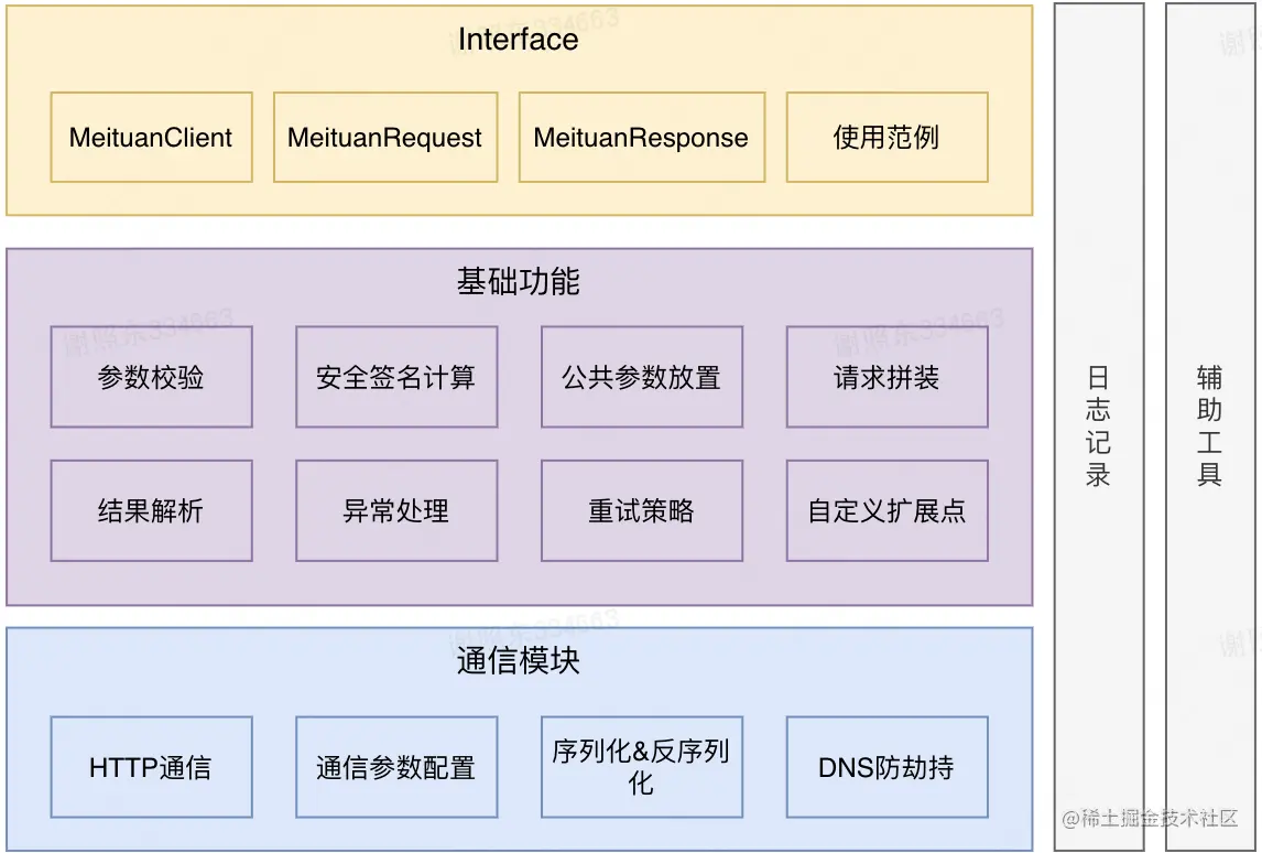 SDK,英文名称为 Software Development Kit,即软件开发工具包,广义上指辅助开发某一类软件的相关工具、文档和范例的集合。在开放平台的场景,我们为开发者提供的SDK应能为其屏蔽调用OpenAPI的通信协议、参数传递规范、接口基础契约(如时间戳、安全签名)等细节,以降低其对接平台API所需的开发成本。具备基本功能的开放平台SDK的架构和功能模块如下所示: