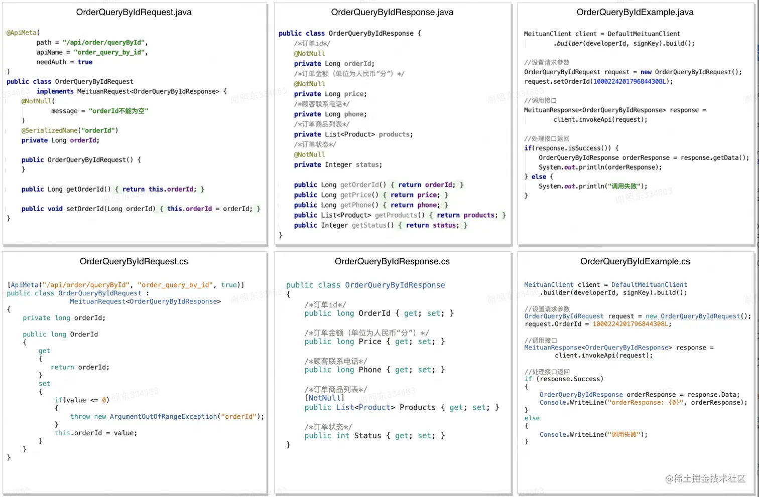 可以看出,参数富模型功能可以进一步减少开发者使用SDK的复杂度。以Java语言版本为例,QueryOrderRequest和QueryOrderResponse两个富模型类中封装了API的请求参数和返回参数的所有字段名、字段类型和字段校验规则等信息,开发者可简单使用字段的getter和setter方法完成对字段的赋值和取值操作,大幅降低了理解成本和出错可能。
