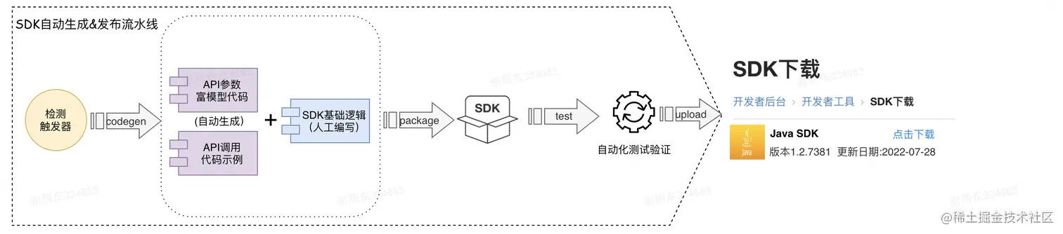 更进一步,在实现了参数富模型代码自动生成后,我们可以通过持续集成(Continious Integration)和持续发布(Continuous Delivery)技术,将SDK的生成、测试和发布流程也尽可能地做到自动化。整体的SDK自动生成流程设计如下图所示: