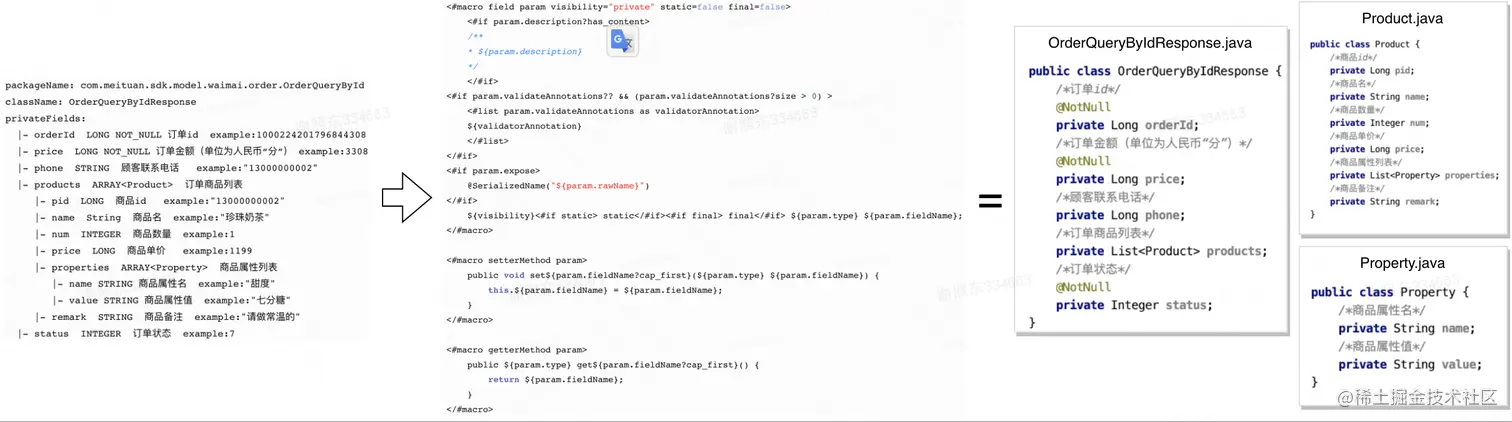 从上面的示例中可以看出,在请求参数模型(Request类)中需要生成Request Path、鉴权配置、字段强类型定义、字段取值、赋值及校验逻辑等代码。在返回参数模型(Response类)中,需要生成接口返回的各个数据字段的强类型定义、取值逻辑及校验规则。调用示例代码则需要包含请求参数赋值、发起接口调用和处理接口返回数据等相关逻辑。
