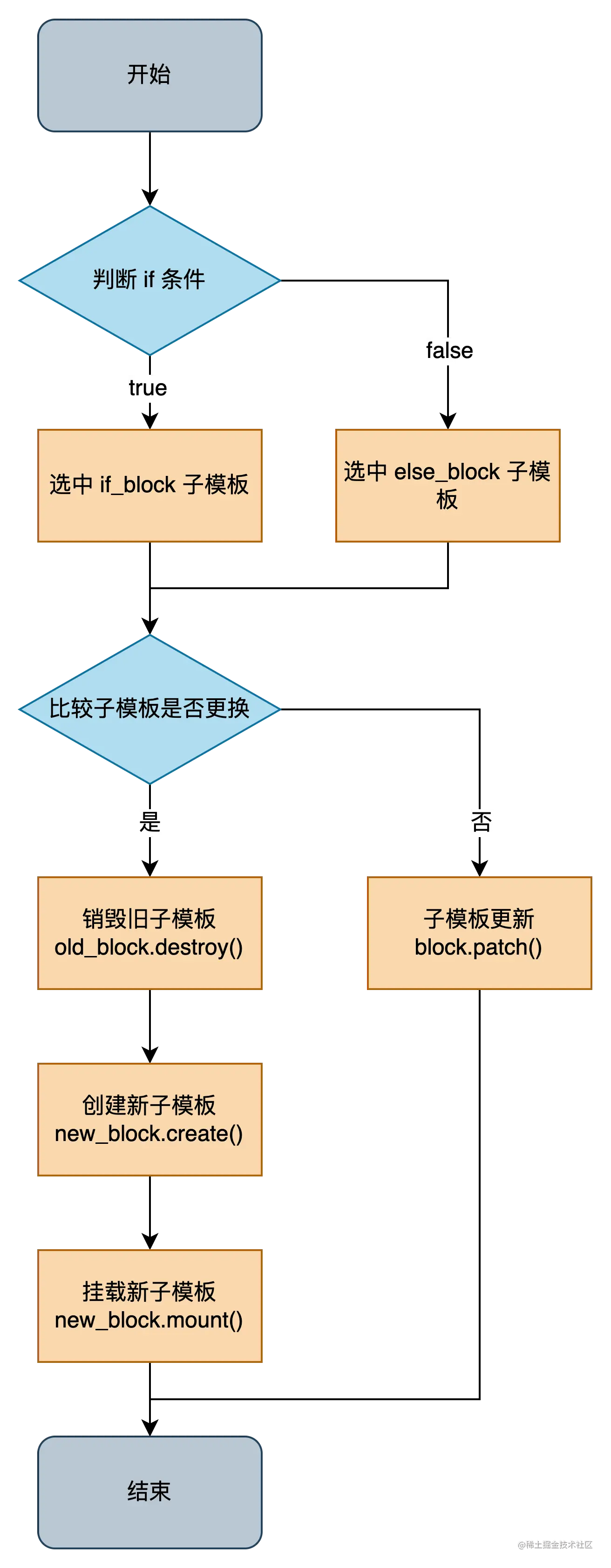 - 条件分支的判断语句会生成select block函数,用于判断条件,并根据条件返回条件判断为真的子模板(if_block)或者条件判断为假的子模板(else_block)