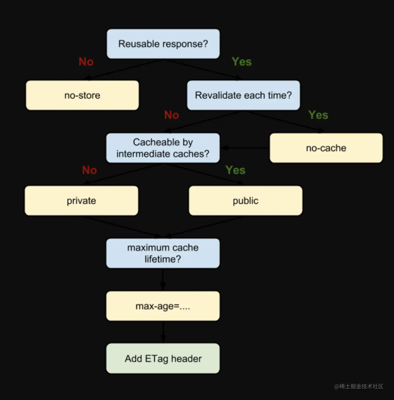 Cache-Control设置no-store,拒绝一切形式的缓存;否则考虑是否每次都需要向服务器进行缓存有效确认,如果需要,那么设Cache-Control的值为no-cache;否则考虑该资源是否可以被代理服务器缓存,根据其结果决定是设置为private还是public;然后考虑该资源的过期时间,设置对应的max-age和s-maxage值;最后,配置协商缓存需要用到的Etag、Last-Modified等参数。 - 个人非常推崇这张流程图给出的决策建议,也强烈推荐大家在理解以上知识点的基础上,将这张图保存下来、在日常开发中用用看,它的可行度非常高。