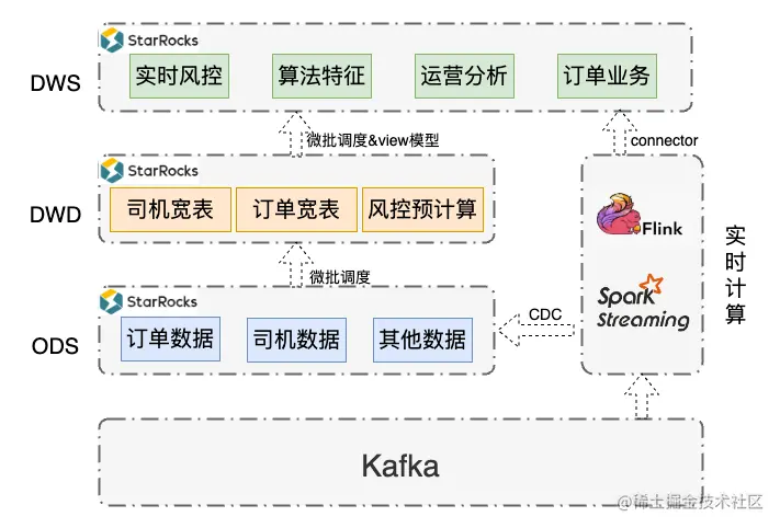- 在风控场景下,能否保障数据的实效性,对于企业损失控制具有重要意义。以司机运营活动的作弊识别为例,之前由于作弊识别滞后的时间较长,存在先发奖又扣走的情况,使得司机的体验变差,且有成本损失风险。将风控识别实时化后,能极大避免此类问题。再比如某些渠道待付率异常上涨,若能实时识别、及时干预,就可以减少不必要的损失。之前风控特征使用的是离线集群 T+1 产生的数据,且整个过程需要复杂代码才能实现。引入 StarRocks 后,我们将 Kafka 的数据通过 Flink CDC 的方式写入到 ODS 层,之后利用 SQL 以微批的方式构建 DWD 和 DWS 层。对于实时性高的数据,则通过 Spark Streaming/Flink 处理后,再利用 StarRocks 提供的 Connector 写入到 DWS 层,最终指标的计算直接通过 SQL 查询 DWS 层即可完成。这不仅使得风控预警更加及时,也对风控指标的快速调整提供了重要支撑,当维度变化或者增加新需求时,工作量从 5 天缩短到 2-3 天即可完成。