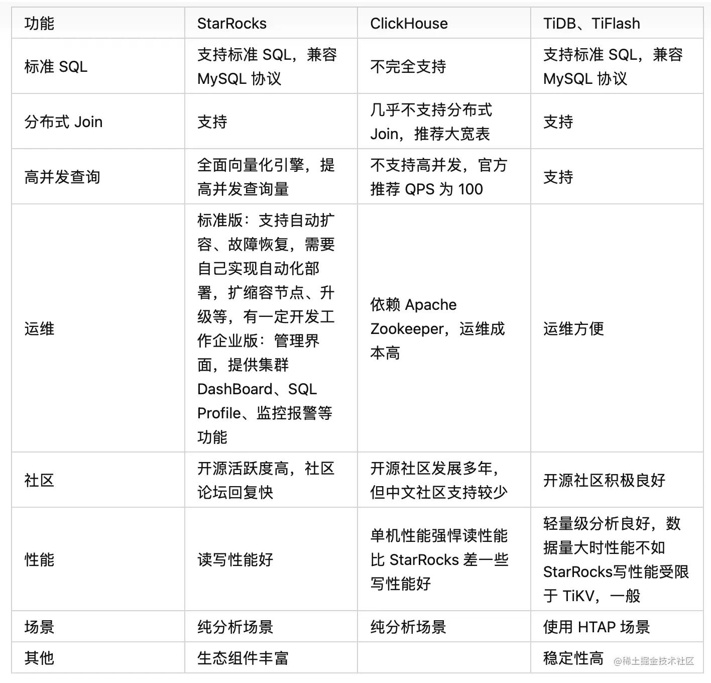 选型过程中,我们针对 StarRocks、ClickHouse、TiDB 做了一些调研和对比: