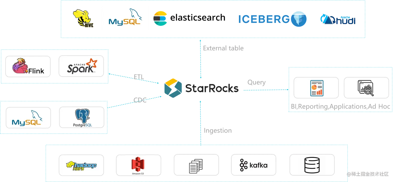 - 支持 MySQL、StarRocks、Elasticsearch、Apache Hive(以下简称 Hive)、Apache Hudi(以下简称 Hudi)、Apache Iceberg(以下简称 Iceberg) 等多种外部表查询数据,重构了数据基础设施,把复杂的分析架构变得简单⽽统⼀。