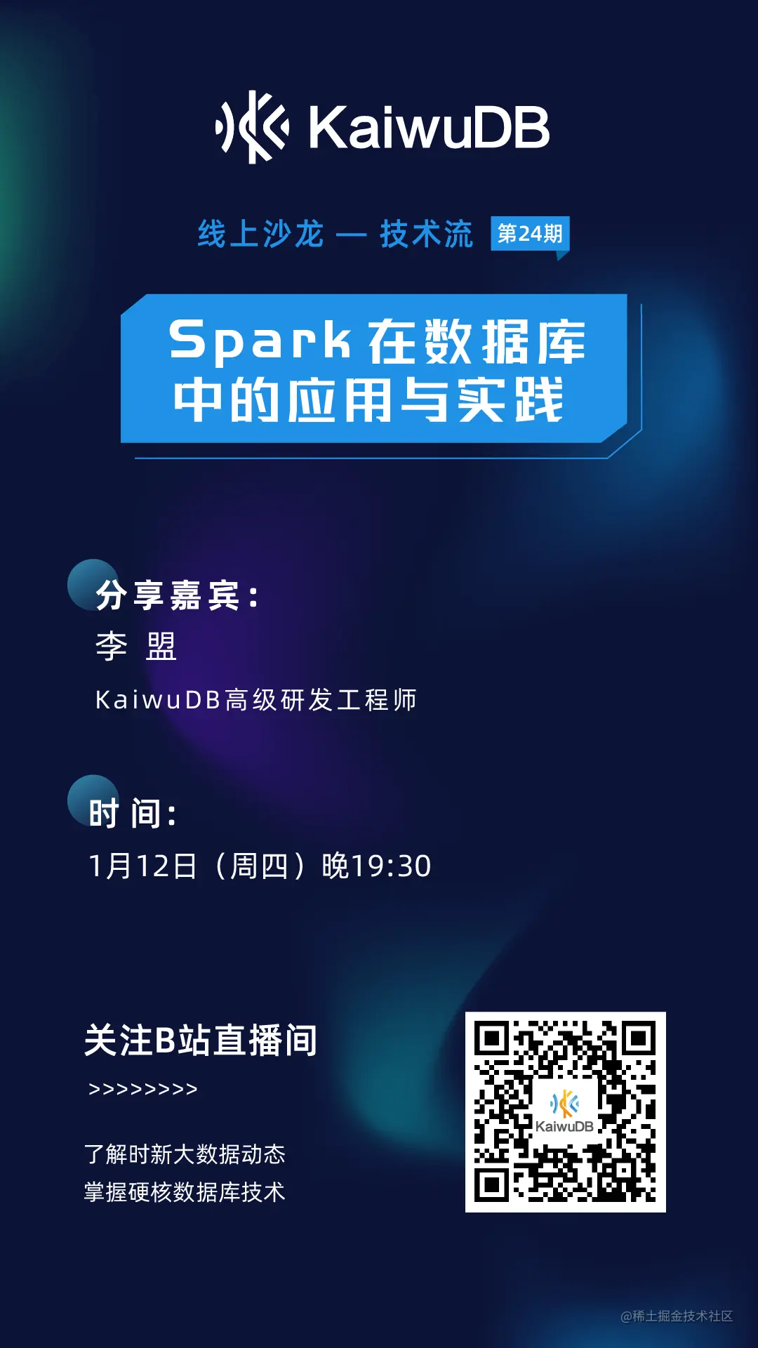 本期直播我们邀请到 KaiwuDB 高级研发工程师李盟老师为大家介绍****《Spark 在 KaiwuDB 中的应用与实践********》********。****李老师主要负责 KaiwuDB 列存存储引擎的开发和维护,拓展优化 KaiwuDB 大数据工具,并参与主导定制化 Spark 计算下推等重点项目。