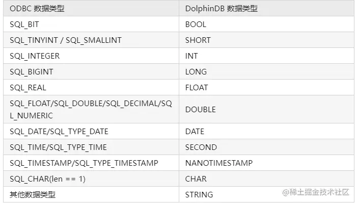 下表展示了 ODBC 与 DolphinDB 中数据类型的映射关系。
