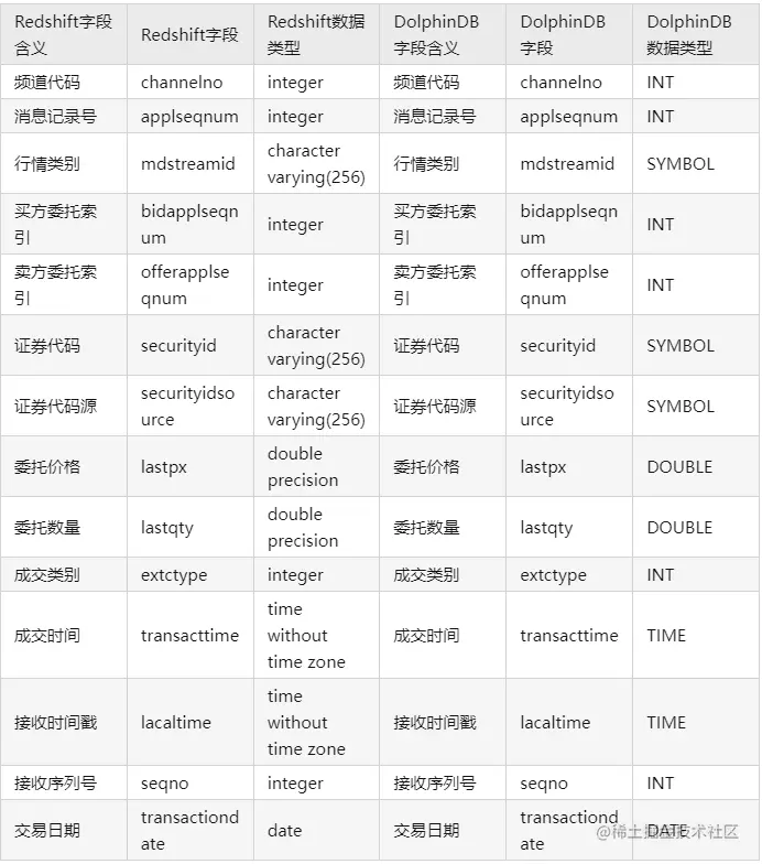 本文中的实践案例利用 ODBC 插件迁移数据,选择了金融领域具有代表性的深交所数据作为数据源,提供了3日的逐笔成交数据(约3亿数据量),储存于 Redshift 中,真实地模拟用户情况。数据迁移过程中,要注意数据类型的转换,下表提供了从 Redshift 到 DolphinDB 相应表结构数据类型。
