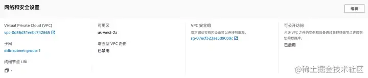 - 编辑集群的属性,修改网络和安全设置,设置 VPC 安全组为刚才创建的安全组,并启用可公开访问。