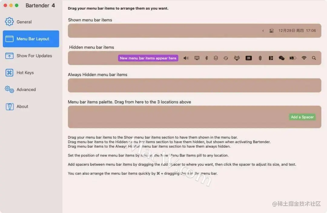 Bartender 的功能很简单,你只需根据习惯,将想要隐藏、展示的软件拖动到对应的位置即可,顶部状态栏会实时变动。