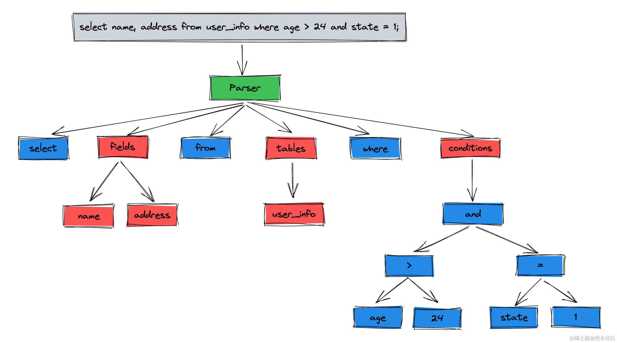 - 解析器根据这条 SQL 语句的语法、词法进行检查,如果没有错误的话会按关键词拆分成一个个节点,最终形成一棵解析树