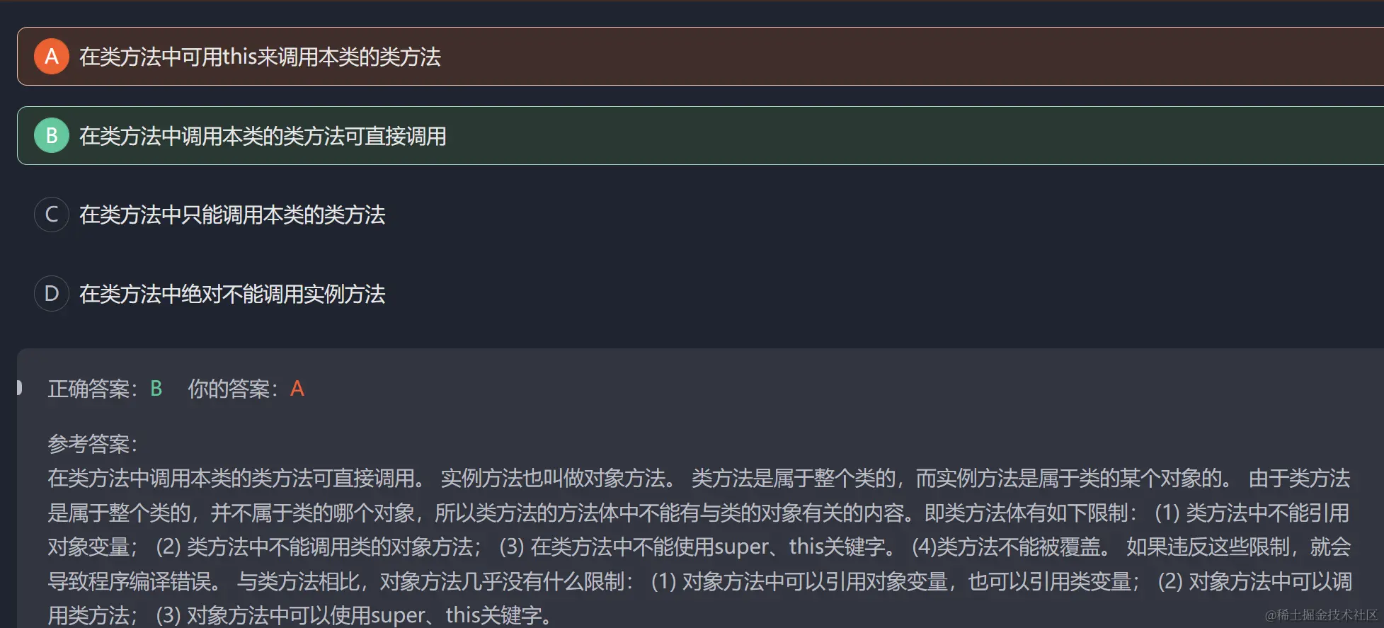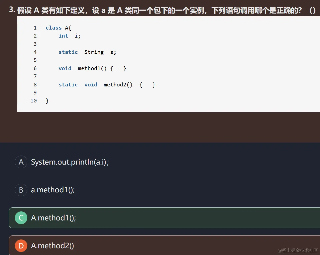 static属性: static方法在编译期就已经生成了,其他方法在运行期生成。非私有的static方法可以用“类.方法名”调用。但是私有的static变量和方法都是不可能被调用的,虽然private static这种写法很少见,但仍然存在,且编译器不会报错。题中static void method2() { }的权限是默认权限,所以可以用“类.方法名”来调用。如果题目中写成private static void method2(){ } ,那么D选项也是错误的。
