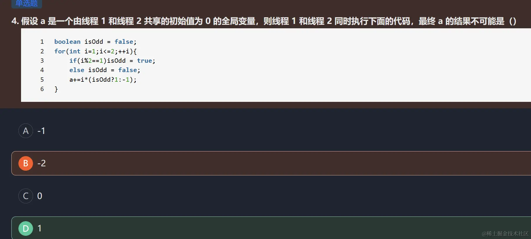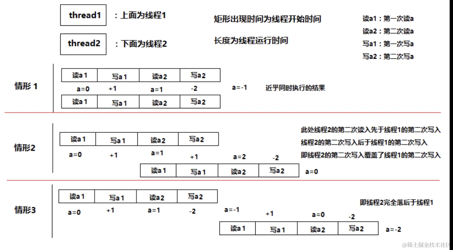 而题目问了是最终a 的结果,所以 a 的结果取决于各自线程对 a 的先后读写的顺序