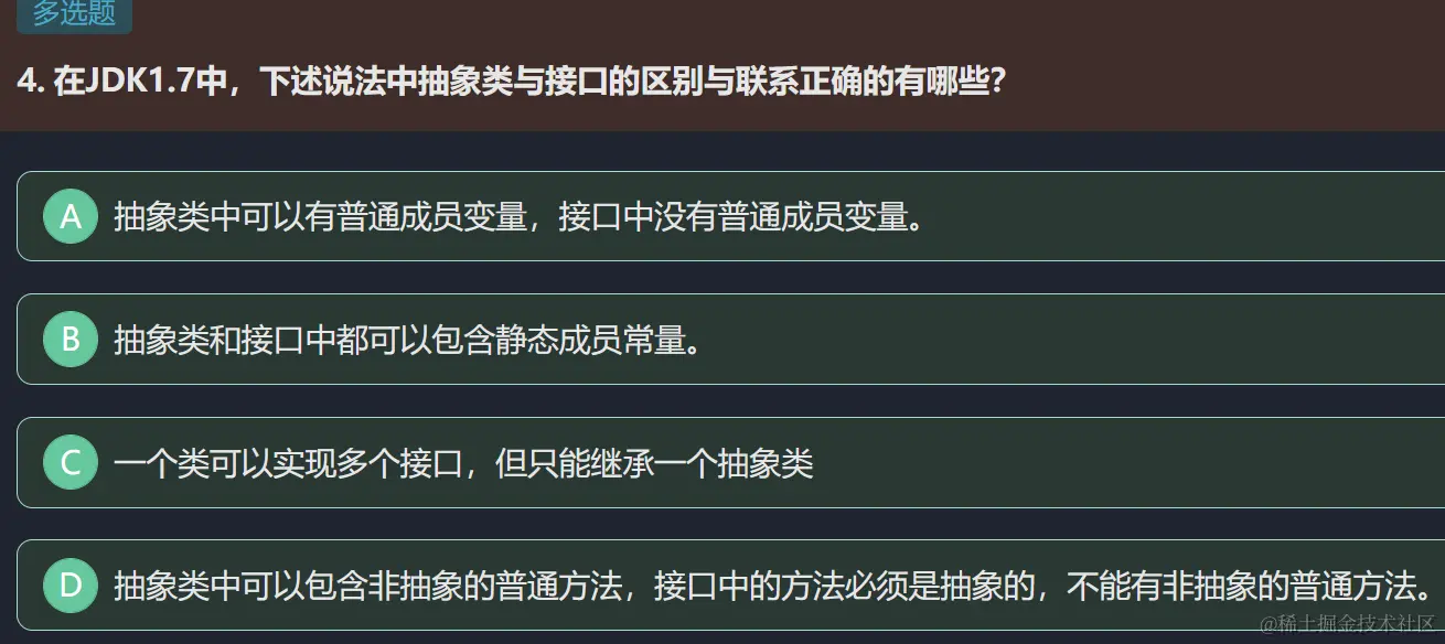 7. 一个类可以实现多个接口,但只能继承一个抽象类。