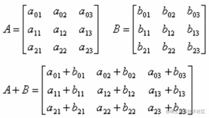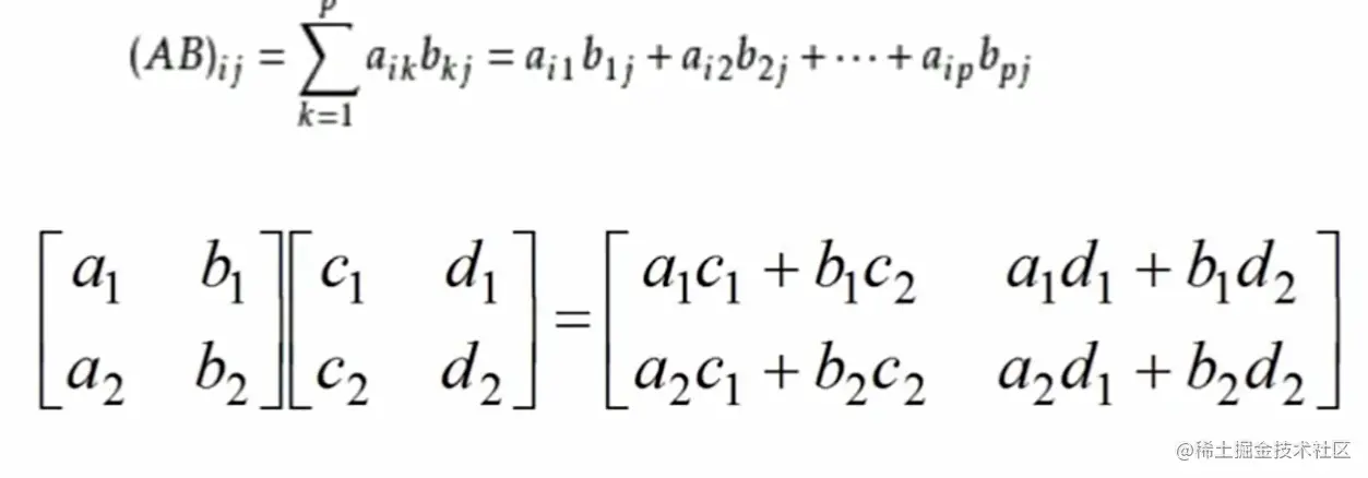 设A为mxp的矩阵,B为pxn的矩阵,mxn的矩阵C为A与B的乘积,记为C=AB,其中矩阵C中的第i行第j列元素可以表示为∶