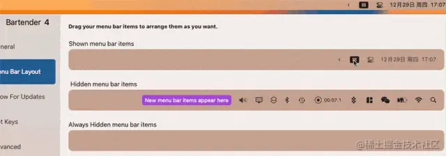 Bartender 的功能很简单,你只需根据习惯,将想要隐藏、展示的软件拖动到对应的位置即可,顶部状态栏会实时变动。