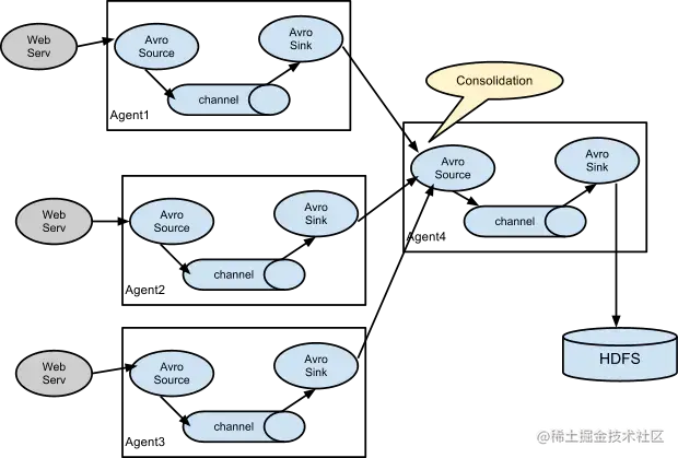 在做日志收集的时候一个常见的场景就是,大量的生产日志的客户端发送数据到少量的附属于存储子系统的消费者agent。例如,从数百个web服务器中收集日志,它们发送数据到十几个负责将数据写入HDFS集群的agent