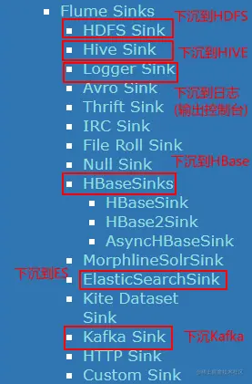 - Sink:下沉地,采集数据的传送目的,用于往下一级agent传递数据或者往最终存储系统传递数据;